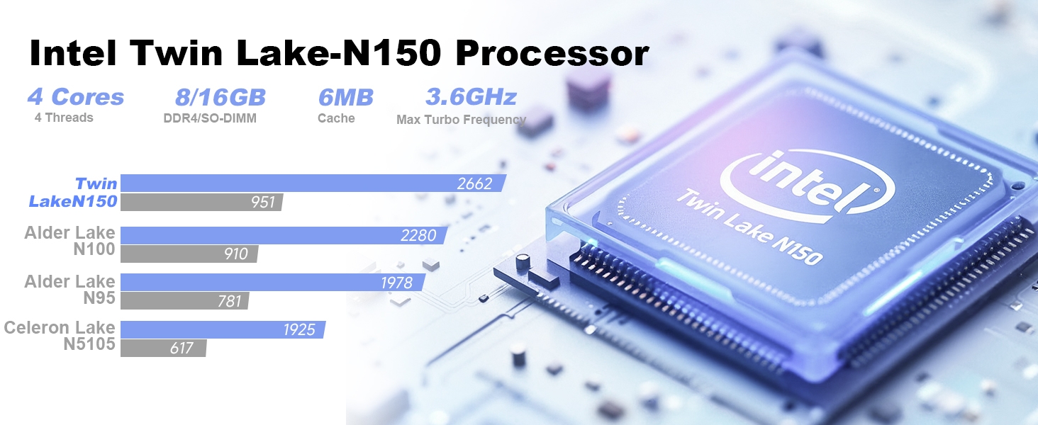 Procesor: Intel® 12th Gen. Twin Lake Processor N150 (4 Core/4 T hreads, 6 MB Intel® Smart Cache, 3.6GHz)