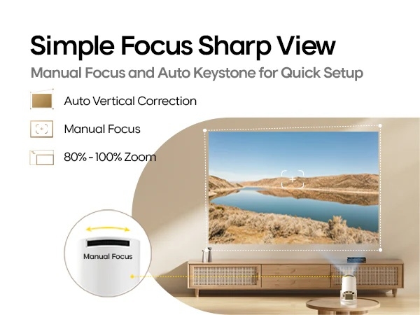 - Korekcija slike: Uređaj nudi automatsku vertikalnu korekciju trapeza (keystone correction) i ručno podešavanje fokusa, što olakšava postavljanje savršene slike.